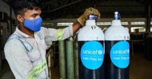 Among other items, UNICEF has increased its shipments of oxygen cylinders and oxygen concentrators. An oxygen concentrator is a portable machine that removes nitrogen from the air to produce a concentrated source of oxygen for the patient. In the first year and a half of the pandemic, UNICEF delivered over 20,600 oxygen concentrators to 94 countries.